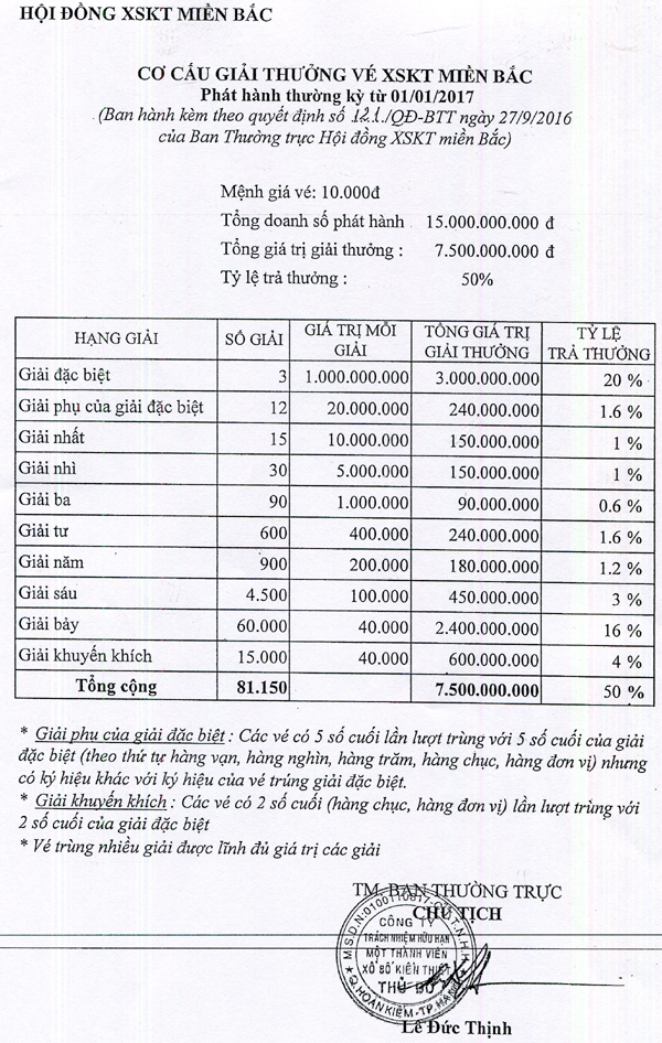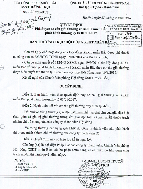 10:46:07 19/09/2018Quyết định phê duyệt cơ cấu giải thưởng vé XSKT miền Bắc phát hành thường kỳ từ ngày 01/01/2017